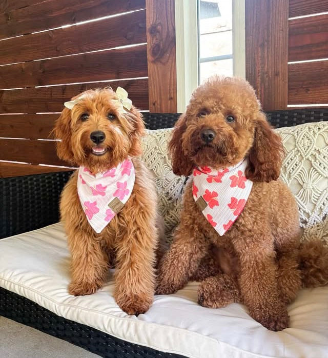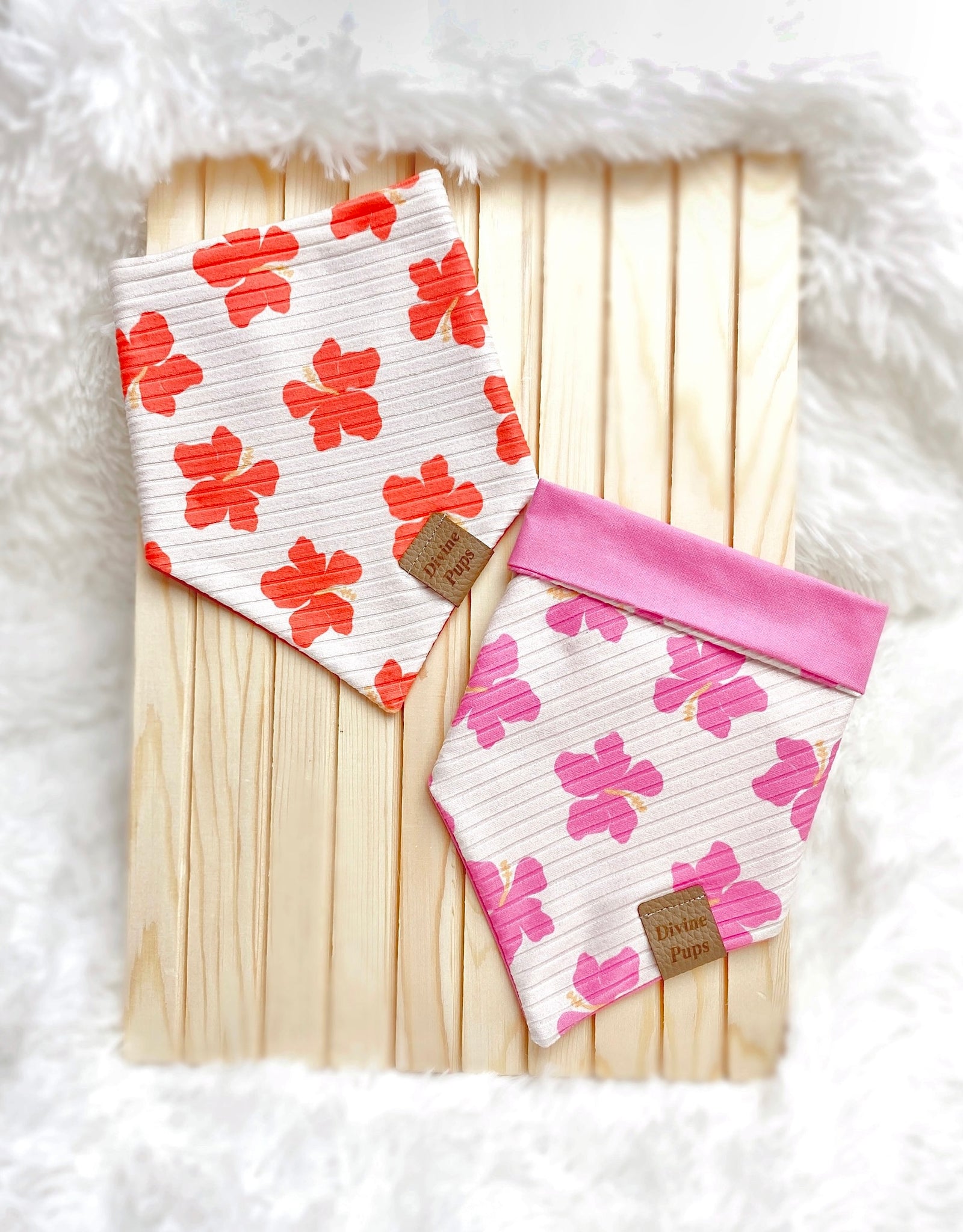 These bandanas are made of a rib knit print and a cotton print on the reversible side. Pick between the orangey red color and the pink color.ย There are 2 buttons on each strap, making it adjustable and easy to snap on! Each bandana is topped off with one of our signature logos, a brown vegan leather fold over tag or gold acrylic tag.ย Handmade in Montreal, Canada.
