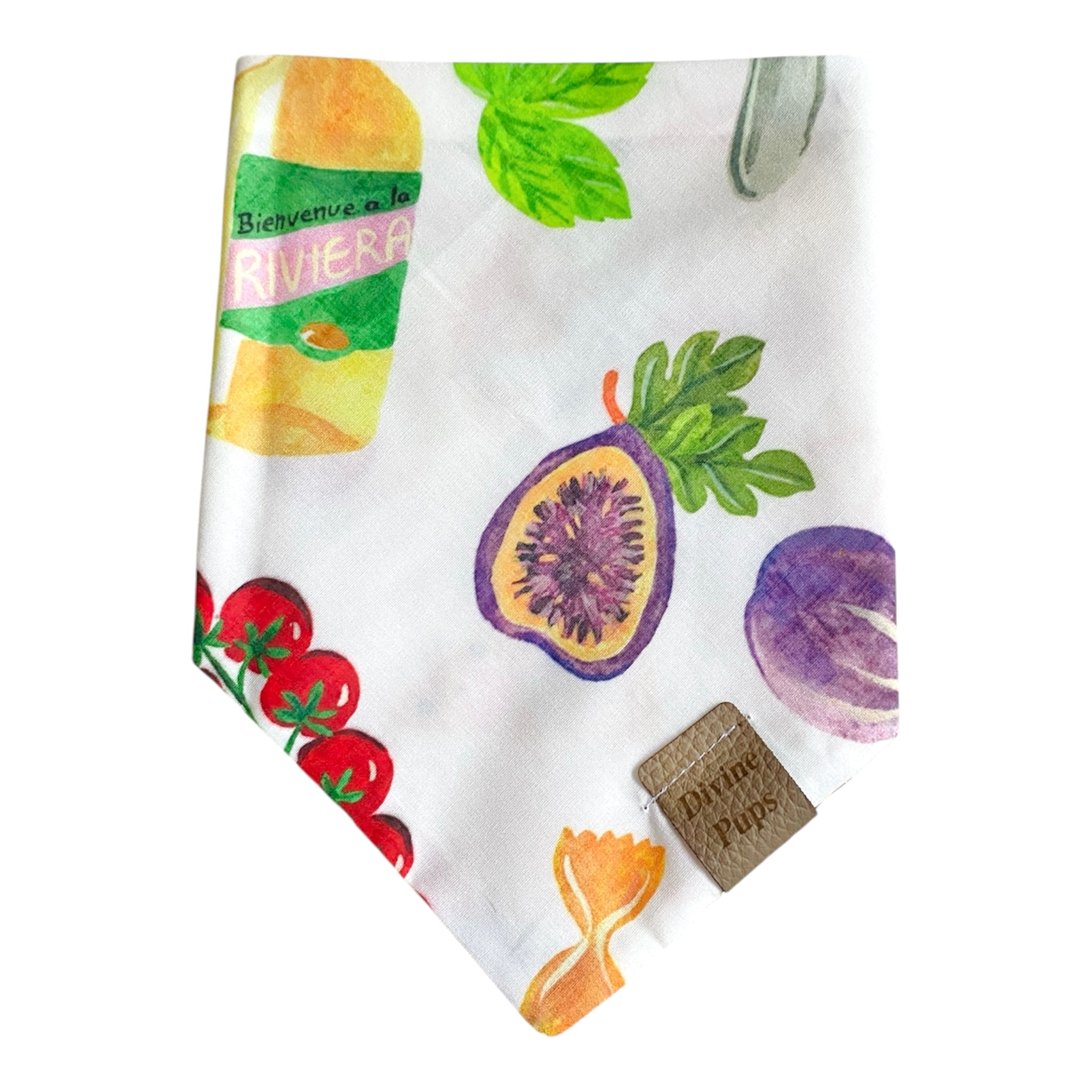 This bandana is made of a cotton print on both sides.Β There are 2 buttons on each strap, making it adjustable and easy to snap on! Each bandana is topped off with one of our signature logos, a brown vegan leather fold over tag or gold acrylic tag.Β Handmade in Montreal, Canada.
