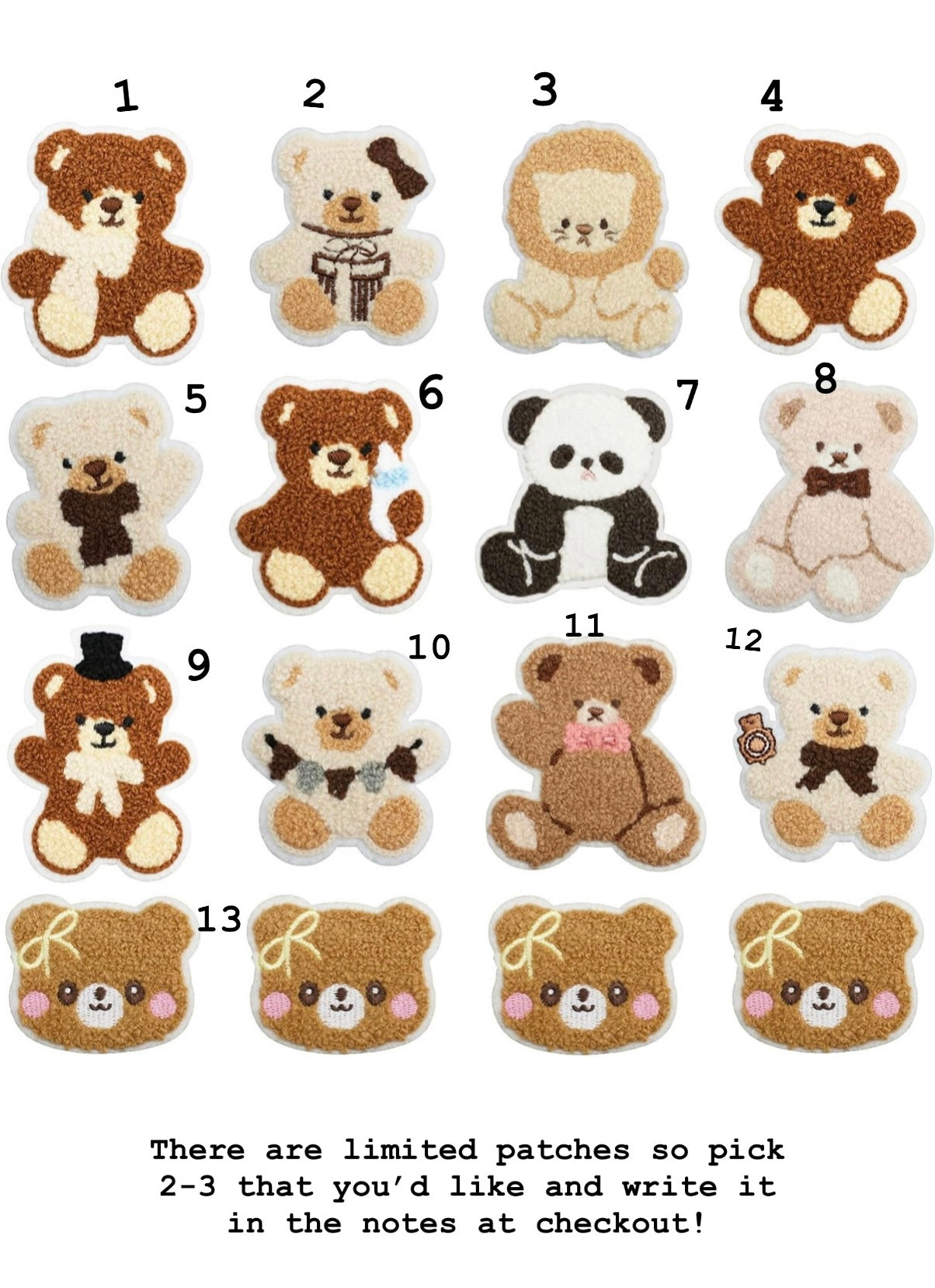 There are limited quantities so pick 2-3 of the bear patches you like and mention it at checkout. I’ll match your bandana with one of the patches you picked!