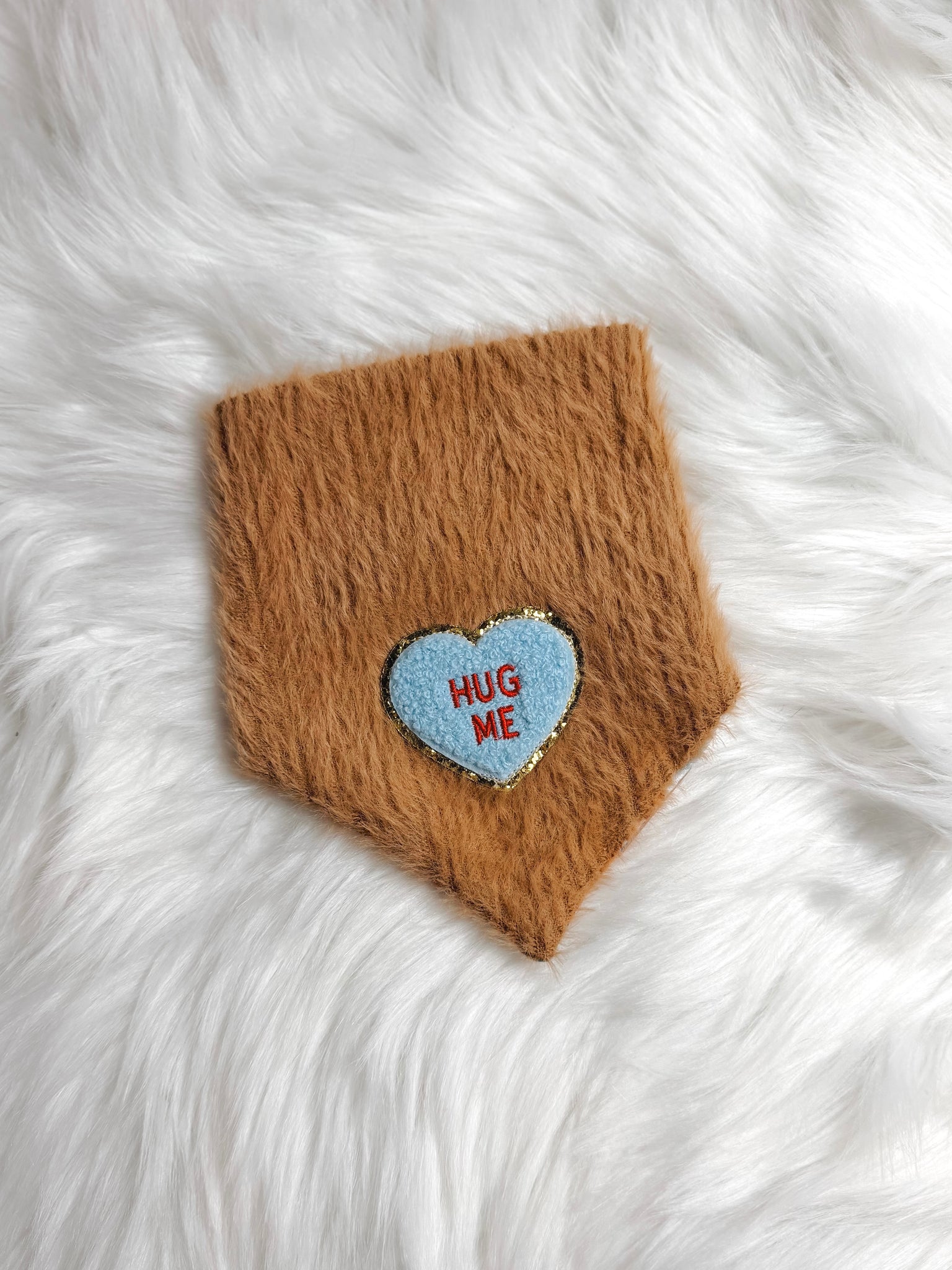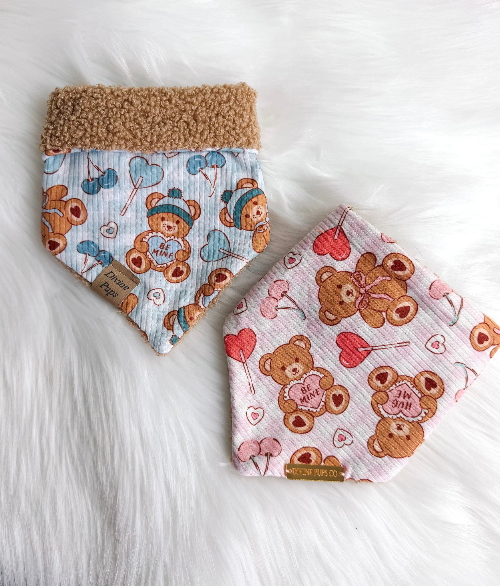 NOTE: This bandana is from last year. We have some premade ones left over in a few sizes. Once those sell, the rest of the bandanas will be made with the fuzzy brown fabric in the second photo. It’s also the same fuzzy fabric as the reversible side of Sweet Teddies!